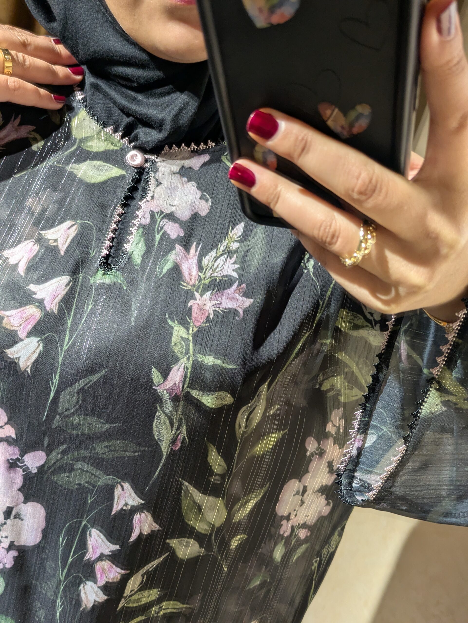 Beneath it, the lightweight muslin qamis adds a subtle touch of femininity with its soft floral pattern and airy texture. The delicate transparency of the muslin fabric contrasts beautifully with the deep black djellaba, creating a layered look that feels both modern and timeless.